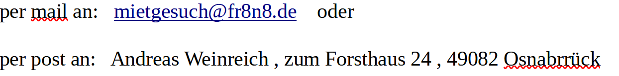 Zur Zeit wohne ich im eigenen Haus, welches aber zum Jahresende verkauft wird.